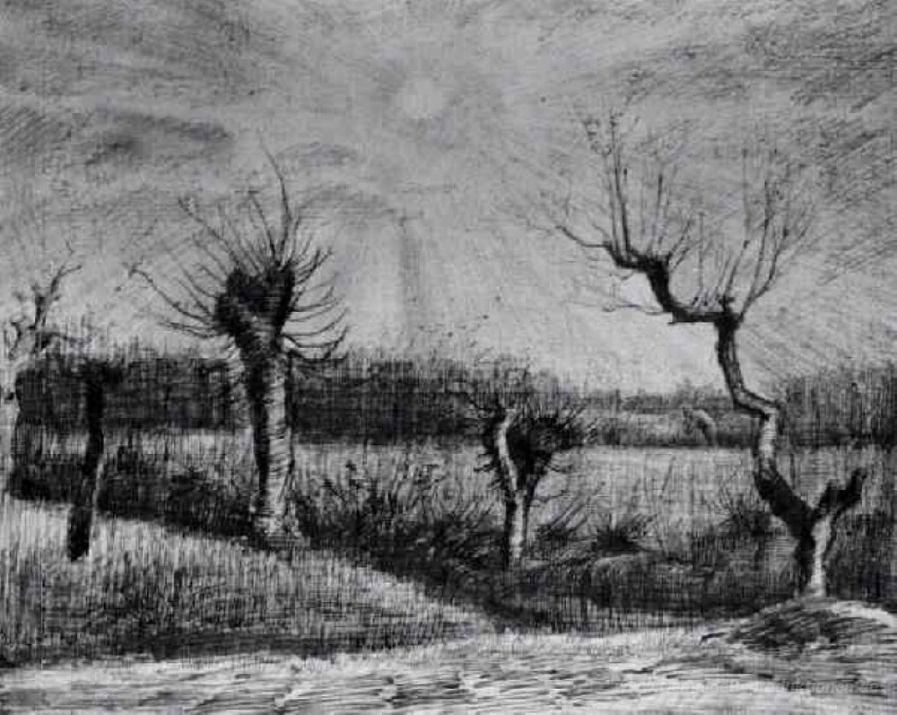 Wir bieten Ihnen eine handgefertigte Reproduktion auf Leinwand des berühmten Kunstwerks 'Landschaft mit Weiden und Sonne durch die Wolken' von Vincent van Gogh, aus dem Reproduktionsmuseum.
