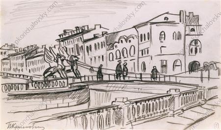 Wir bieten Ihnen eine handgefertigte Reproduktion auf Leinwand des berühmten Kunstwerks 'Leningrad. Bankbrücke.' von Pyotr Konchalovsky, aus dem Reproduktionsmuseum.