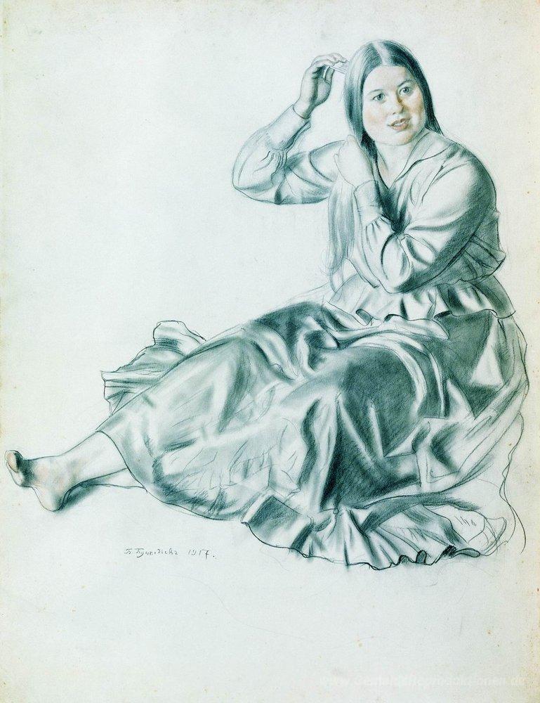Wir bieten Ihnen eine handgefertigte Reproduktion auf Leinwand des berühmten Kunstwerks 'Mädchen die Haare bürsten' von Boris Kustodiev, aus dem Reproduktionsmuseum.