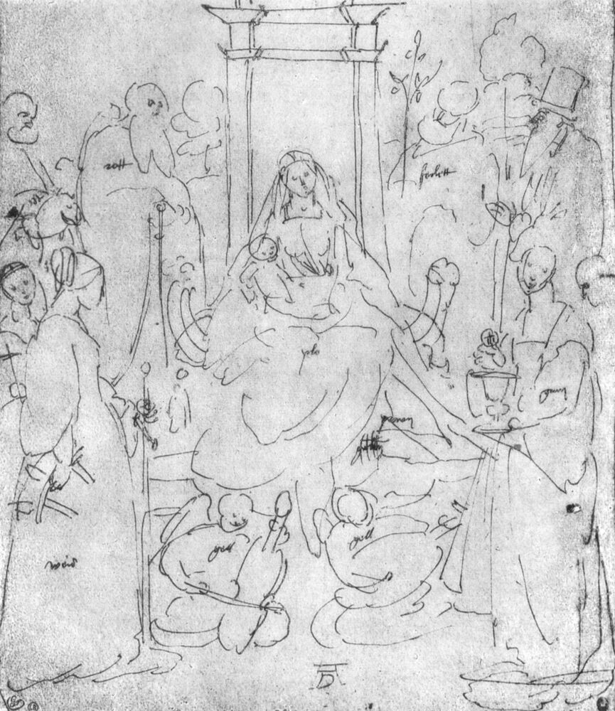 Wir bieten Ihnen eine handgefertigte Reproduktion auf Leinwand des berühmten Kunstwerks 'Madonna mit Kind, Heiligen und Engeln spielen' von Albrecht Durer, aus dem Reproduktionsmuseum.
