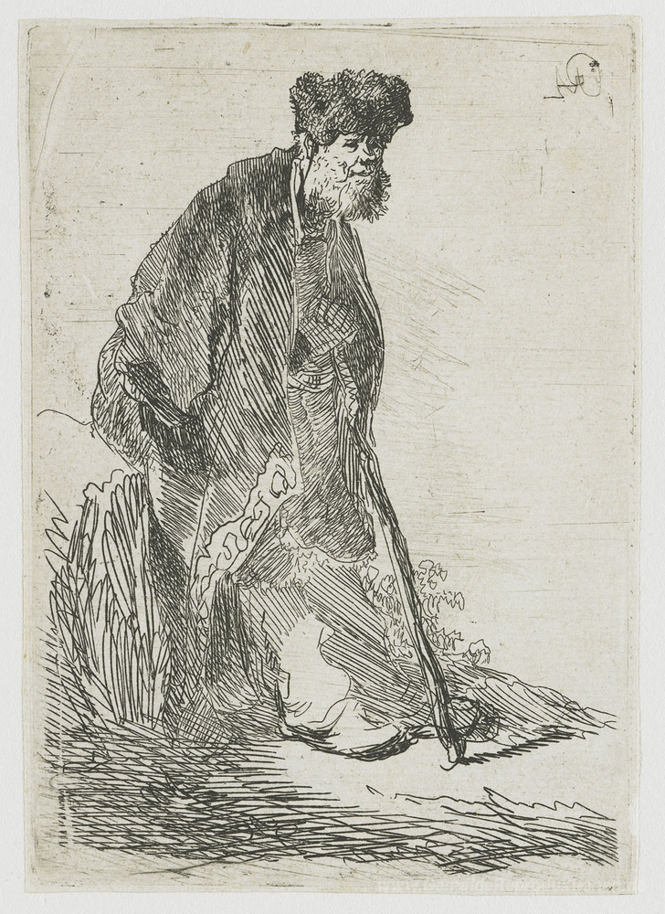 Wir bieten Ihnen eine handgefertigte Reproduktion auf Leinwand des berühmten Kunstwerks 'Mann in einem Mantel und Pelzmütze lehnt an einem Bank' von Rembrandt, aus dem Reproduktionsmuseum.