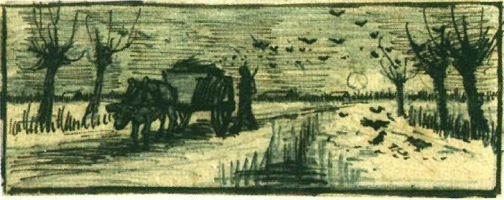 Wir bieten Ihnen eine handgefertigte Reproduktion auf Leinwand des berühmten Kunstwerks 'Ochsenkarren im Schnee' von Vincent van Gogh, aus dem Reproduktionsmuseum.