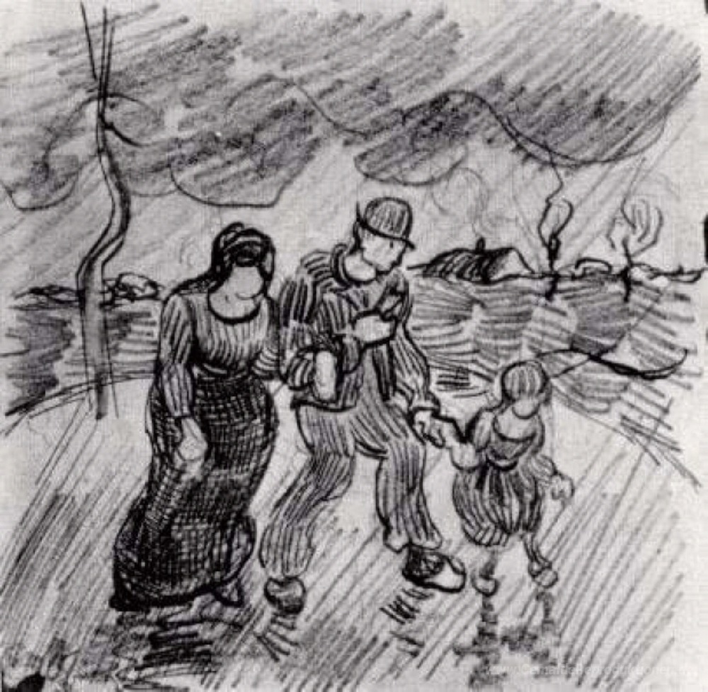 Wir bieten Ihnen eine handgefertigte Reproduktion auf Leinwand des berühmten Kunstwerks 'Paar Arm in Arm mit einem Kind im Regen' von Vincent van Gogh, aus dem Reproduktionsmuseum.
