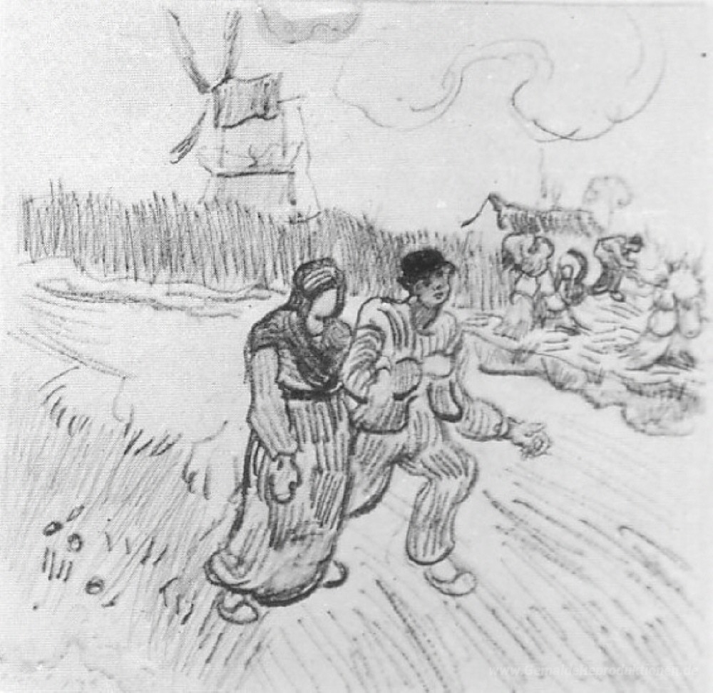 Wir bieten Ihnen eine handgefertigte Reproduktion auf Leinwand des berühmten Kunstwerks 'Paar Arm in Arm und andere Figuren, mit einer Windmühle im Hinte' von Vincent van Gogh, aus dem Reproduktionsmuseum.