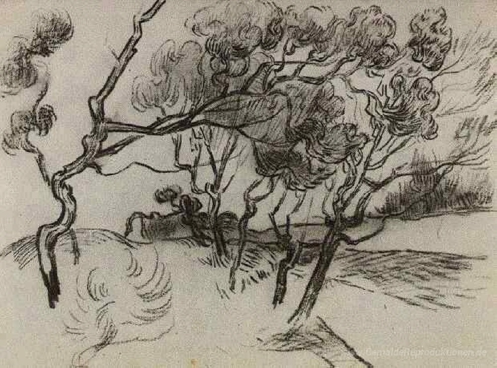 Wir bieten Ihnen eine handgefertigte Reproduktion auf Leinwand des berühmten Kunstwerks 'Pine Bäume entlang einer Straße zu einem Haus' von Vincent van Gogh, aus dem Reproduktionsmuseum.