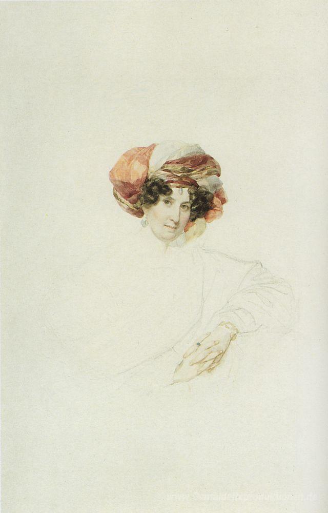 Wir bieten Ihnen eine handgefertigte Reproduktion auf Leinwand des berühmten Kunstwerks 'Porträt einer unbekannten Frau in einem Turban' von Karl Bryullov, aus dem Reproduktionsmuseum.