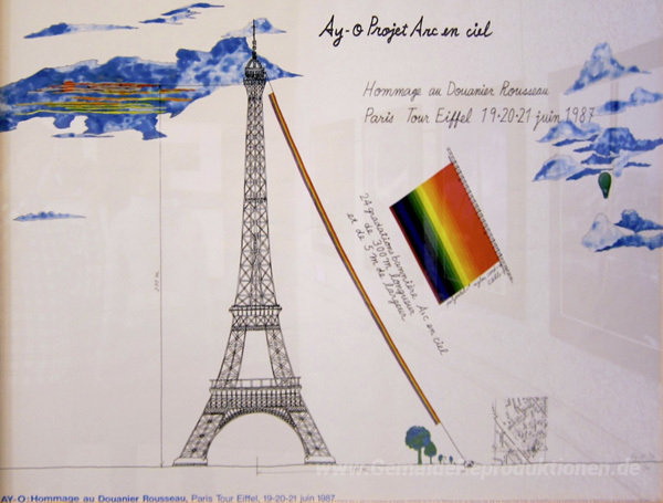Wir bieten Ihnen eine handgefertigte Reproduktion auf Leinwand des berühmten Kunstwerks 'Regenbogen-Eiffelturm-Projekt-Skizze' von Ay-O, aus dem Reproduktionsmuseum.