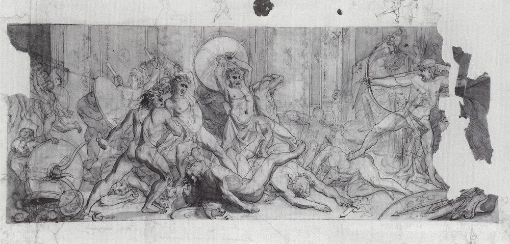 Wir bieten Ihnen eine handgefertigte Reproduktion auf Leinwand des berühmten Kunstwerks 'Schlagen der Verlobten von Penelope Rückkehr Ulysses' von Vasily Vereshchagin, aus dem Reproduktionsmuseum.