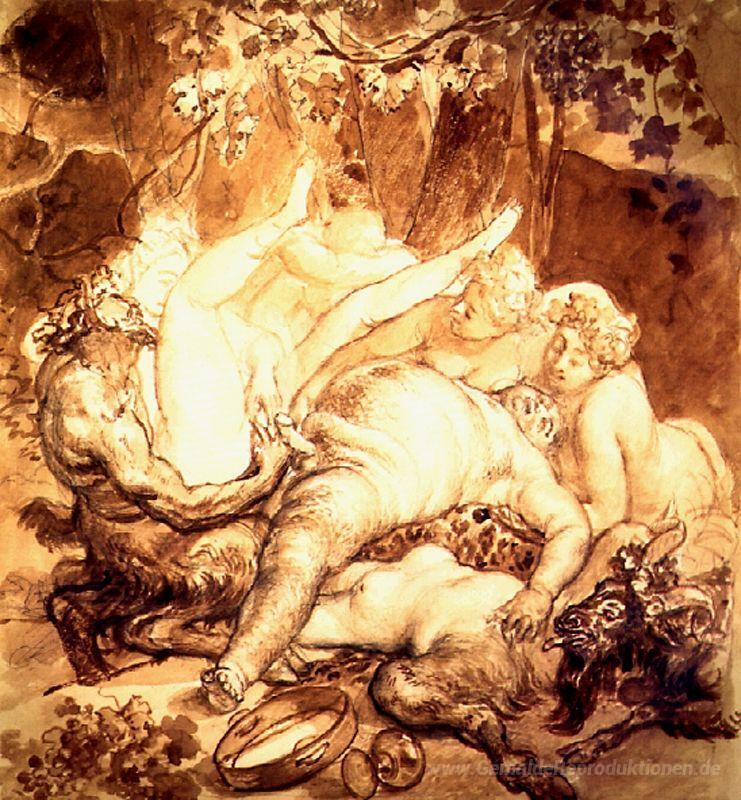 Wir bieten Ihnen eine handgefertigte Reproduktion auf Leinwand des berühmten Kunstwerks 'Silen, Satyr und Bacchanals' von Karl Bryullov, aus dem Reproduktionsmuseum.