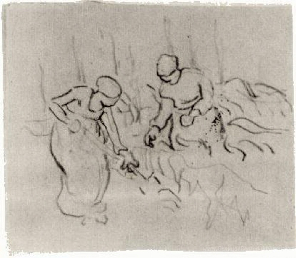 Wir bieten Ihnen eine handgefertigte Reproduktion auf Leinwand des berühmten Kunstwerks 'Sketch von Frauen in einem Feld' von Vincent van Gogh, aus dem Reproduktionsmuseum.