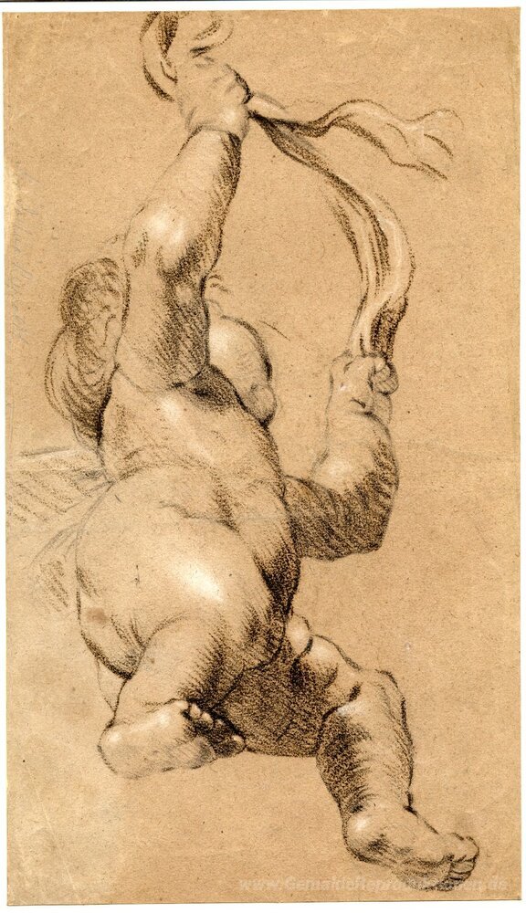 Wir bieten Ihnen eine handgefertigte Reproduktion auf Leinwand des berühmten Kunstwerks 'Skizze der Putto Holding eine Schärpe in beiden Händen, von unte' von Joshua Reynolds, aus dem Reproduktionsmuseum.