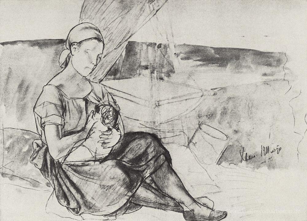 Wir bieten Ihnen eine handgefertigte Reproduktion auf Leinwand des berühmten Kunstwerks 'Skizze für ein Bild der Mutter' von Kuzma Petrov-Vodkin, aus dem Reproduktionsmuseum.