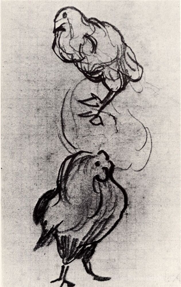Wir bieten Ihnen eine handgefertigte Reproduktion auf Leinwand des berühmten Kunstwerks 'Skizzen von einer Henne und einem Hahn' von Vincent van Gogh, aus dem Reproduktionsmuseum.
