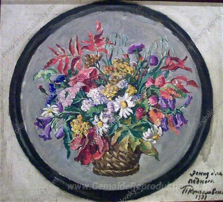 Wir bieten Ihnen eine handgefertigte Reproduktion auf Leinwand des berühmten Kunstwerks 'Stillleben. Herbst-Blumen in einem Korb. Studie für das Fach ein' von Pyotr Konchalovsky, aus dem Reproduktionsmuseum.