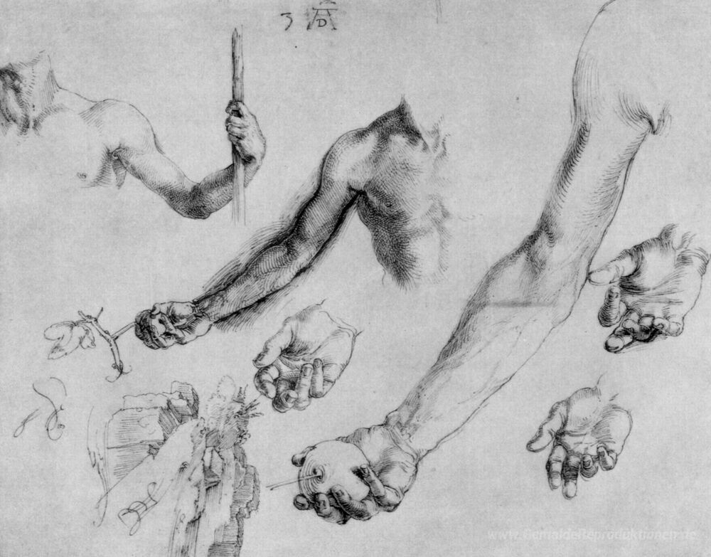 Wir bieten Ihnen eine handgefertigte Reproduktion auf Leinwand des berühmten Kunstwerks 'Studie der männlichen Hände und Arme' von Albrecht Durer, aus dem Reproduktionsmuseum.
