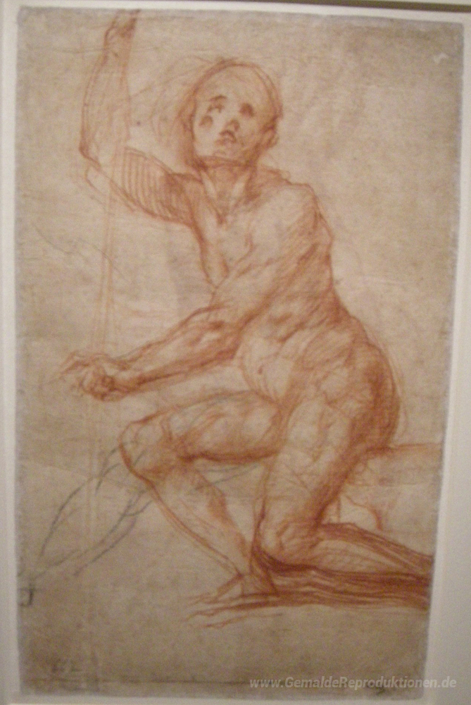 Wir bieten Ihnen eine handgefertigte Reproduktion auf Leinwand des berühmten Kunstwerks 'Studie eines sitzenden Mannes' von Jacopo Pontormo, aus dem Reproduktionsmuseum.
