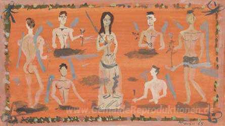 Wir bieten Ihnen eine handgefertigte Reproduktion auf Leinwand des berühmten Kunstwerks 'Studie für ein Wandbehang mit einem Thema aus Elytis Gedicht Axi' von Yiannis Tsaroychis, aus dem Reproduktionsmuseum.