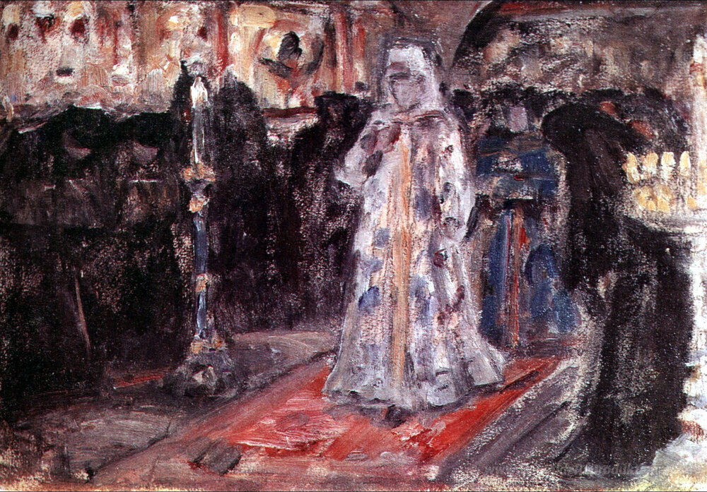 Wir bieten Ihnen eine handgefertigte Reproduktion auf Leinwand des berühmten Kunstwerks 'Studie zur "Tsarevna Besuch des Klosters"' von Vasily Surikov, aus dem Reproduktionsmuseum.