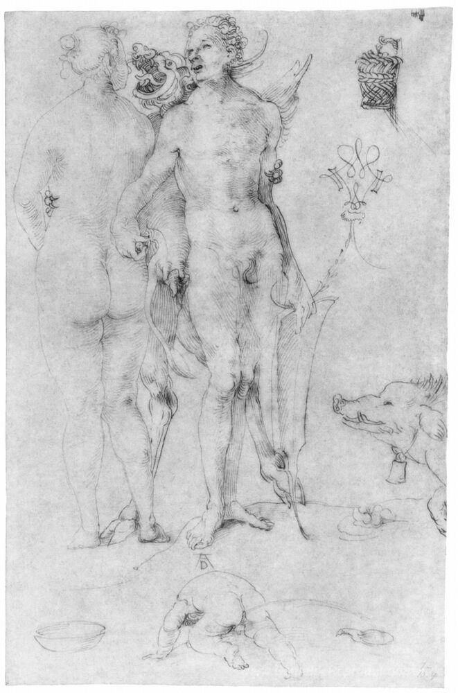 Wir bieten Ihnen eine handgefertigte Reproduktion auf Leinwand des berühmten Kunstwerks 'Studienblatt, nacktes Paar und der Teufel' von Albrecht Durer, aus dem Reproduktionsmuseum.
