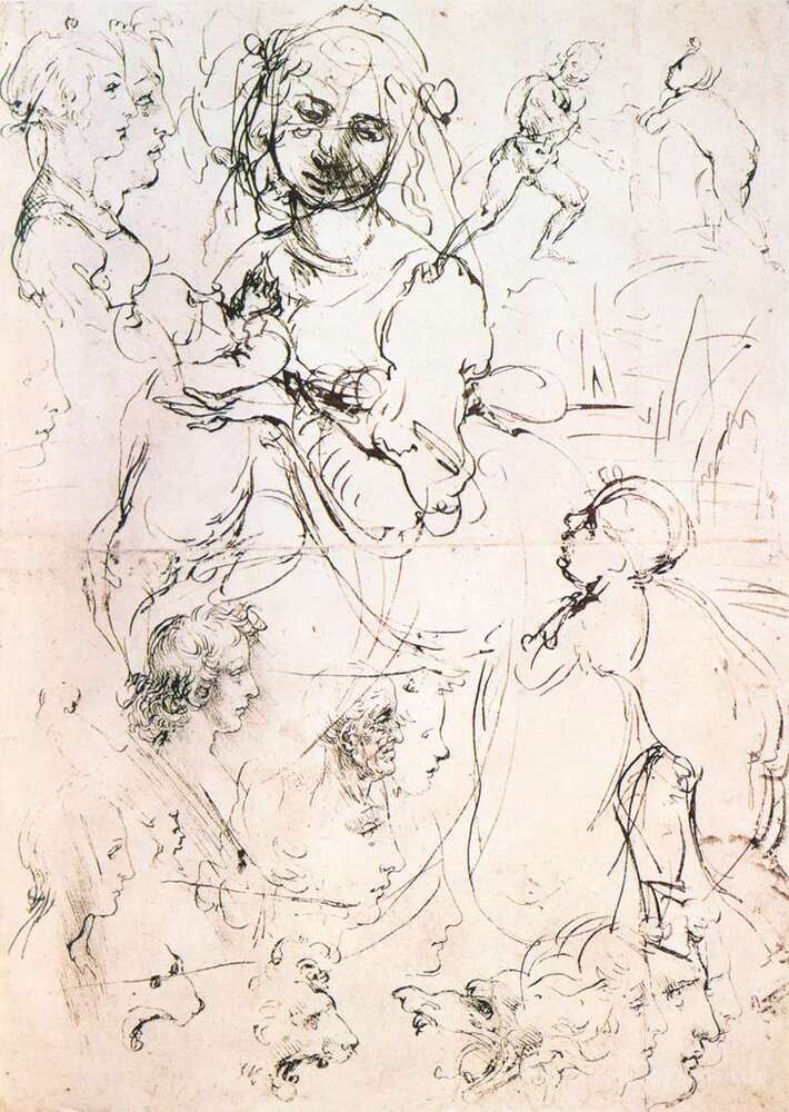 Wir bieten Ihnen eine handgefertigte Reproduktion auf Leinwand des berühmten Kunstwerks 'Studium der Pflege Madonna und Profilköpfe' von Leonardo da Vinci, aus dem Reproduktionsmuseum.