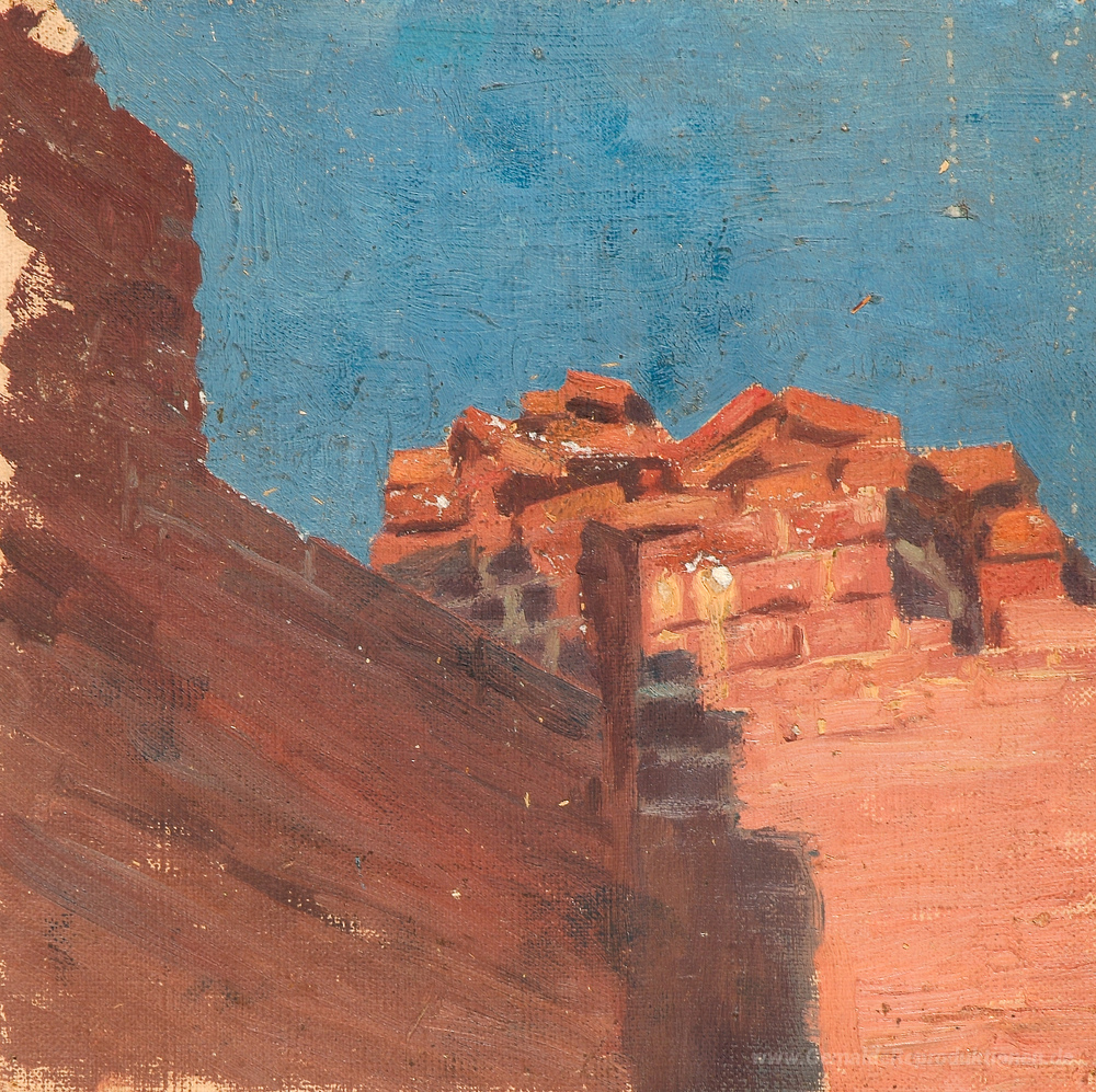 Wir bieten Ihnen eine handgefertigte Reproduktion auf Leinwand des berühmten Kunstwerks 'Studium der Wände' von Nicholas Roerich, aus dem Reproduktionsmuseum.