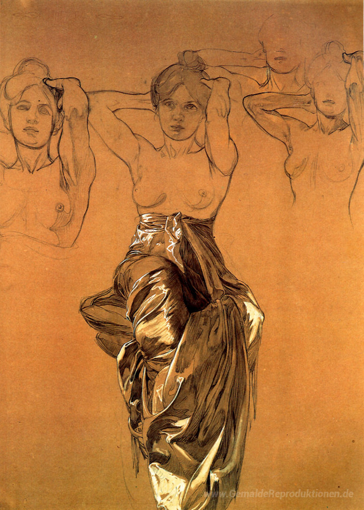 Wir bieten Ihnen eine handgefertigte Reproduktion auf Leinwand des berühmten Kunstwerks 'Study of Drapery' von Alphonse Mucha, aus dem Reproduktionsmuseum.