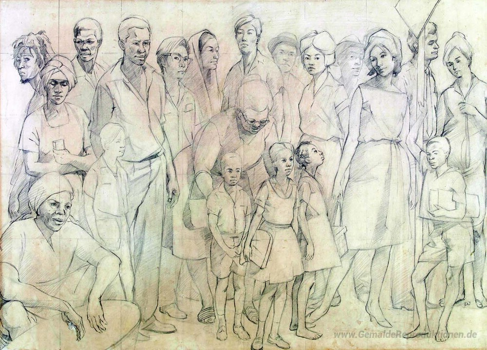 Wir bieten Ihnen eine handgefertigte Reproduktion auf Leinwand des berühmten Kunstwerks 'Study Zeichnung für Out of Many, One People 1962' von Barrington Watson, aus dem Reproduktionsmuseum.