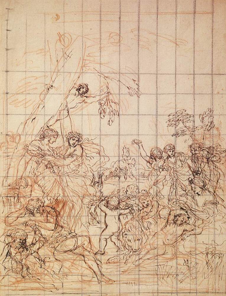 Wir bieten Ihnen eine handgefertigte Reproduktion auf Leinwand des berühmten Kunstwerks 'The Age of Gold' von Pietro da Cortona, aus dem Reproduktionsmuseum.