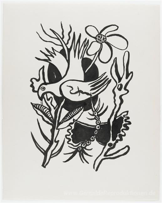 Wir bieten Ihnen eine handgefertigte Reproduktion auf Leinwand des berühmten Kunstwerks 'Titel angesichts der Vogel in den Blumen, Studie für den Circus' von Fernand Leger, aus dem Reproduktionsmuseum.