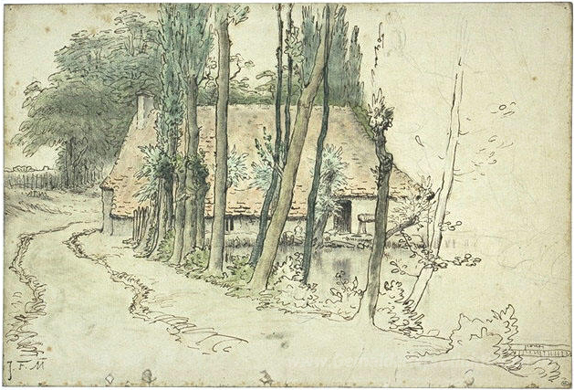 Wir bieten Ihnen eine handgefertigte Reproduktion auf Leinwand des berühmten Kunstwerks 'Umgebung von Vichy, Haus in der Nähe des Wassers' von Jean-Francois Millet, aus dem Reproduktionsmuseum.