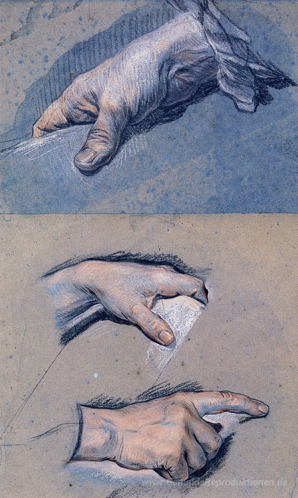 Wir bieten Ihnen eine handgefertigte Reproduktion auf Leinwand des berühmten Kunstwerks 'Untersuchungen von Menschenhänden' von Maurice Quentin de La Tour, aus dem Reproduktionsmuseum.
