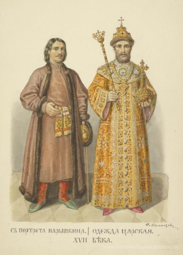 Wir bieten Ihnen eine handgefertigte Reproduktion auf Leinwand des berühmten Kunstwerks 'Vom Porträt des Naryschkin. Königliche Kleidung' von Fyodor Solntsev, aus dem Reproduktionsmuseum.