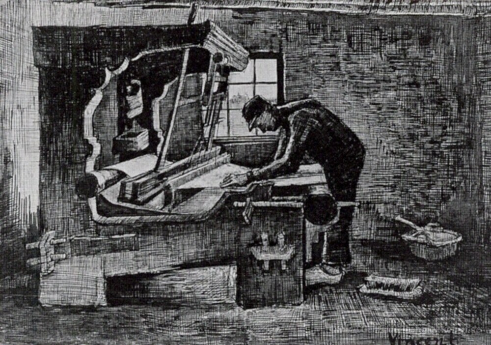 Wir bieten Ihnen eine handgefertigte Reproduktion auf Leinwand des berühmten Kunstwerks 'Weber, der vor einem Webstuhl' von Vincent van Gogh, aus dem Reproduktionsmuseum.