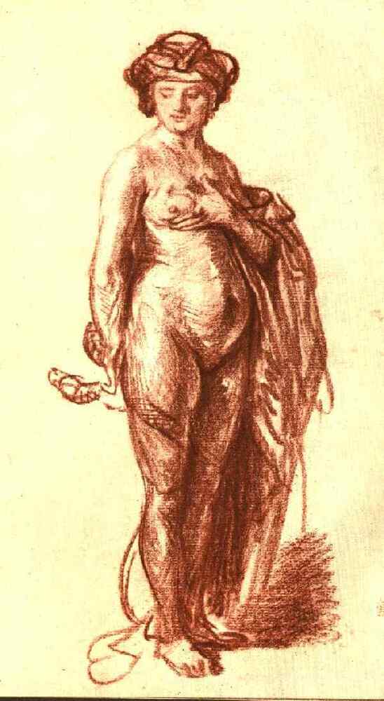 Wir bieten Ihnen eine handgefertigte Reproduktion auf Leinwand des berühmten Kunstwerks 'Weiblicher Akt mit Snake (Cleopatra)' von Rembrandt, aus dem Reproduktionsmuseum.