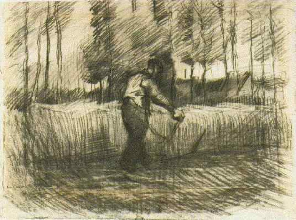Wir bieten Ihnen eine handgefertigte Reproduktion auf Leinwand des berühmten Kunstwerks 'Weizen-Feld mit Bäumen und Mähwerk' von Vincent van Gogh, aus dem Reproduktionsmuseum.
