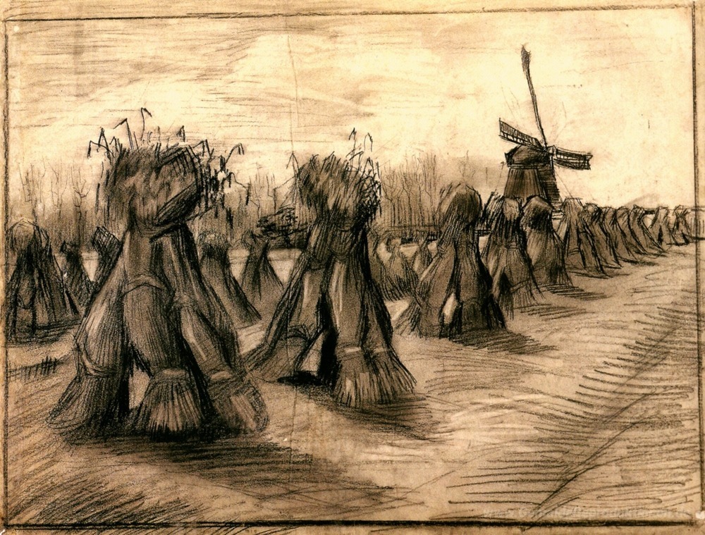 Wir bieten Ihnen eine handgefertigte Reproduktion auf Leinwand des berühmten Kunstwerks 'Weizen-Feld mit Garben und eine Windmühle' von Vincent van Gogh, aus dem Reproduktionsmuseum.