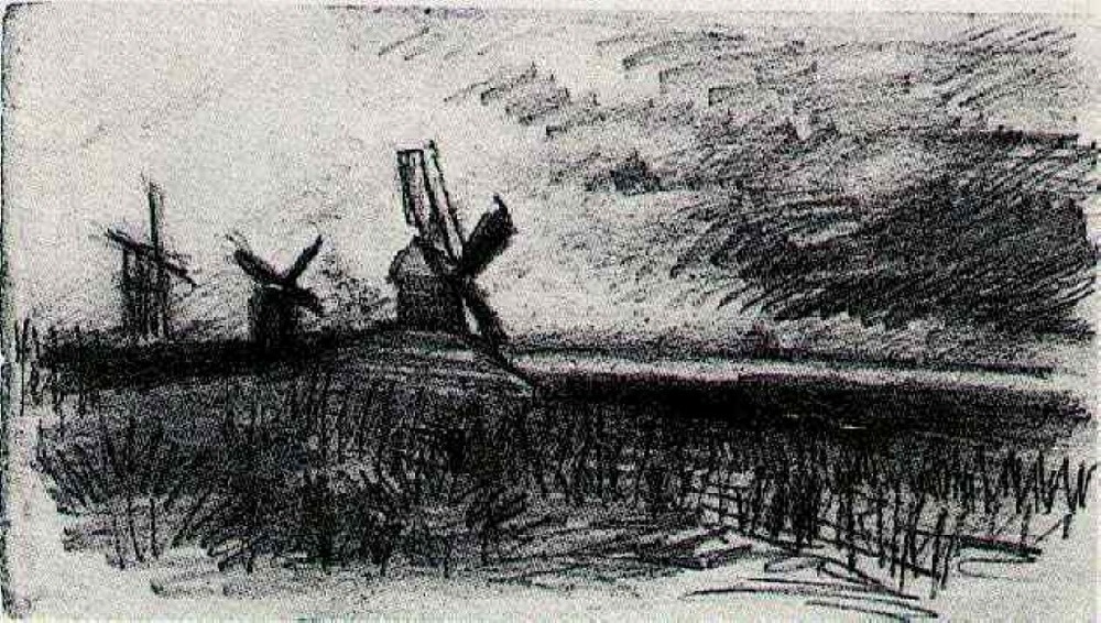 Wir bieten Ihnen eine handgefertigte Reproduktion auf Leinwand des berühmten Kunstwerks 'Windmühlen am Montmartre' von Vincent van Gogh, aus dem Reproduktionsmuseum.
