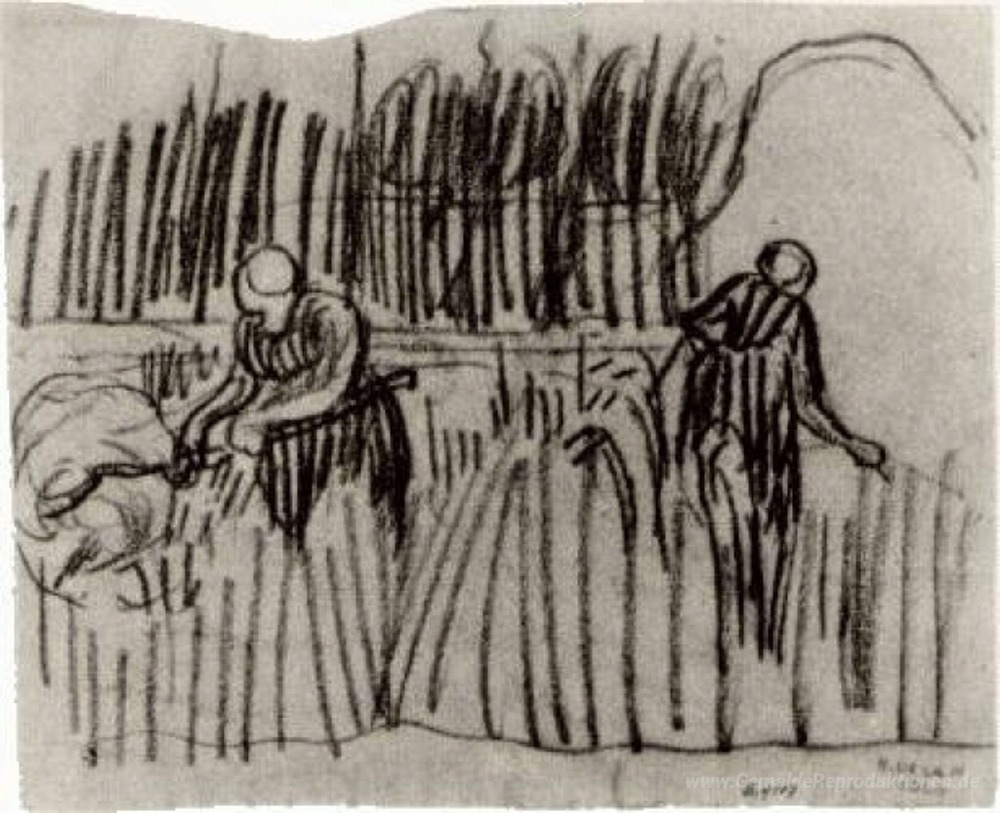Wir bieten Ihnen eine handgefertigte Reproduktion auf Leinwand des berühmten Kunstwerks 'Zwei Frauen, die Arbeiten im Weizenfeld' von Vincent van Gogh, aus dem Reproduktionsmuseum.