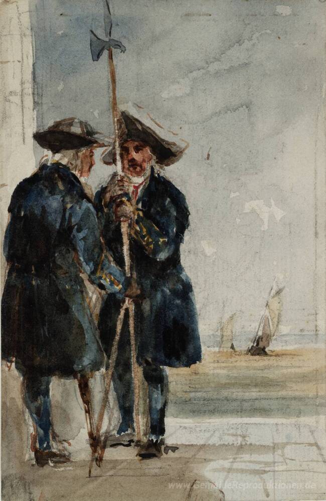 Wir bieten Ihnen eine handgefertigte Reproduktion auf Leinwand des berühmten Kunstwerks 'Zwei Naval Rentner mit Versand Hinter' von David Cox, aus dem Reproduktionsmuseum.