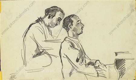 Wir bieten Ihnen eine handgefertigte Reproduktion auf Leinwand des berühmten Kunstwerks 'Zwei Skizzen von italienischen Pianisten Carlo Tšekki am Klavier' von Pyotr Konchalovsky, aus dem Reproduktionsmuseum.