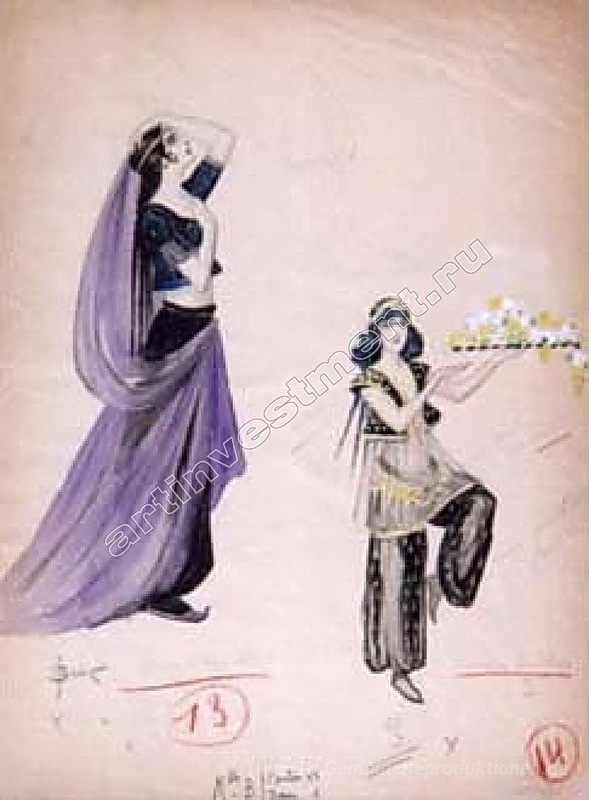 Wir bieten Ihnen eine handgefertigte Reproduktion auf Leinwand des berühmten Kunstwerks 'Zwei Skizzen von Kostümen' von Sergey Solomko, aus dem Reproduktionsmuseum.