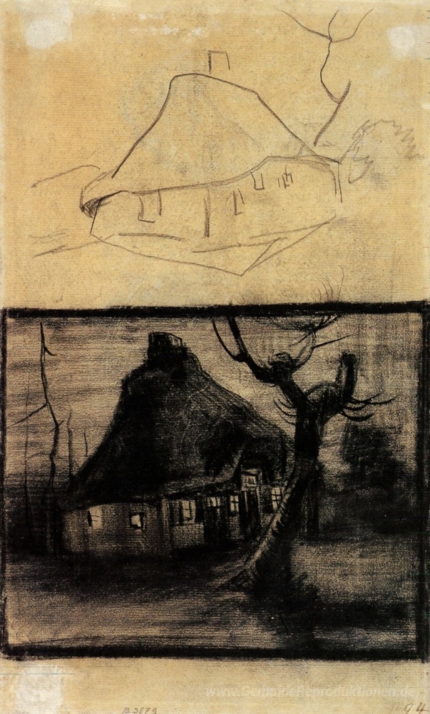 Wir bieten Ihnen eine handgefertigte Reproduktion auf Leinwand des berühmten Kunstwerks 'Zwei Studien eines Cottage' von Vincent van Gogh, aus dem Reproduktionsmuseum.