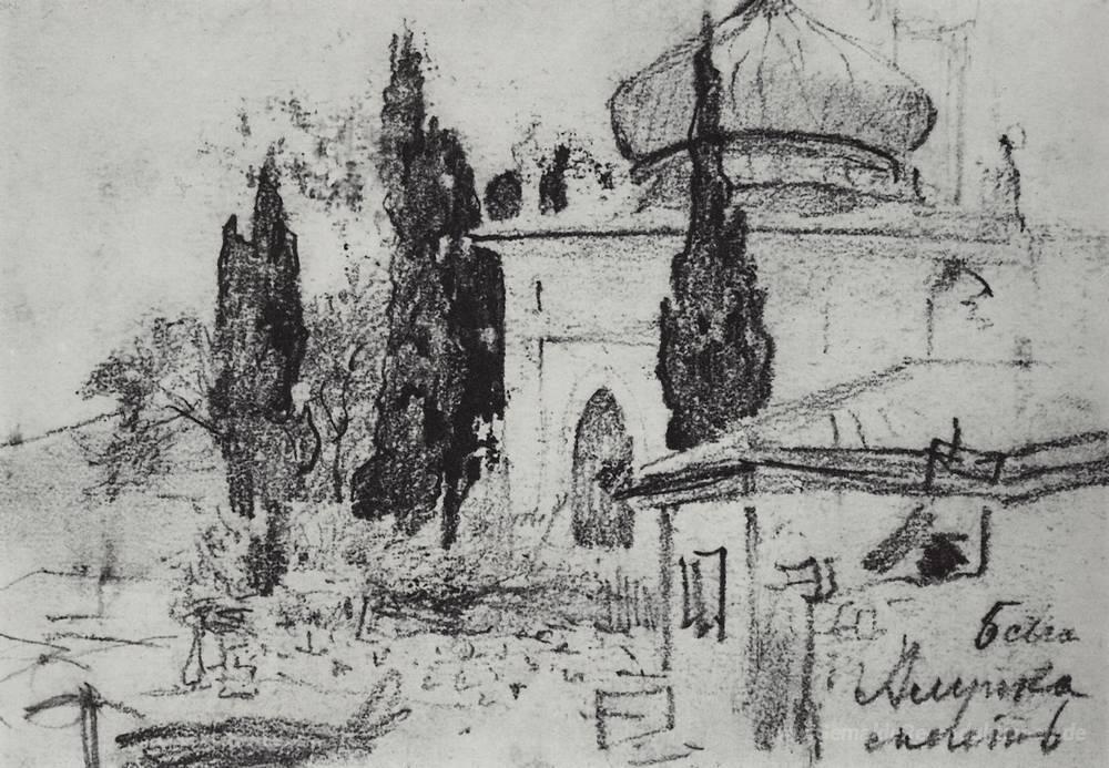 Wir bieten Ihnen eine handgefertigte Reproduktion auf Leinwand des berühmten Kunstwerks 'Zypresse-Bäume in der Moschee' von Isaac Levitan, aus dem Reproduktionsmuseum.