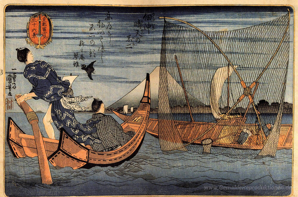 Wir bieten Ihnen eine handgefertigte Reproduktion auf Leinwand des berühmten Kunstwerks 'Ansicht von Mt. Fuji' von Utagawa Kuniyoshi, aus dem Reproduktionsmuseum.