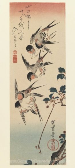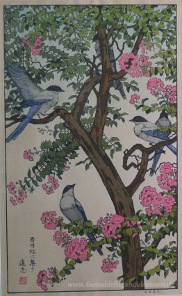 Zwei grüne Pfauen auf dem Ast eines blühenden Baum