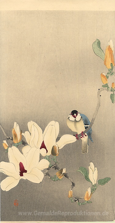 Wir bieten Ihnen eine handgefertigte Reproduktion auf Leinwand des berühmten Kunstwerks 'Blue Bird und Magnolia' von Ohara Koson, aus dem Reproduktionsmuseum.