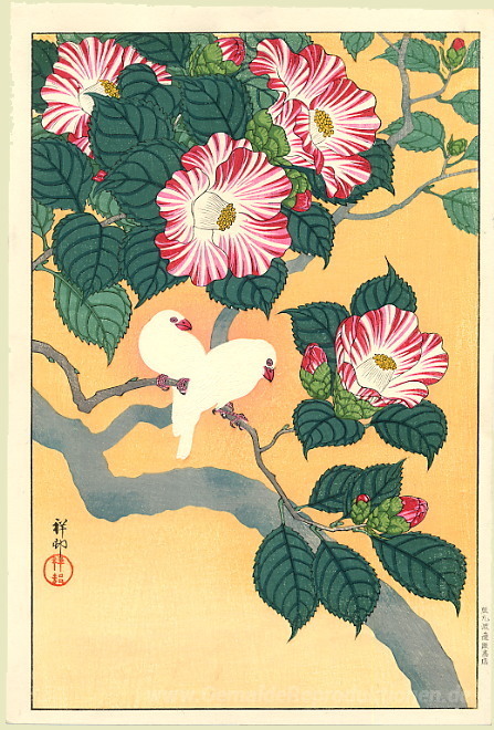 Wir bieten Ihnen eine handgefertigte Reproduktion auf Leinwand des berühmten Kunstwerks 'Camellia and Rice Birds' von Ohara Koson, aus dem Reproduktionsmuseum.
