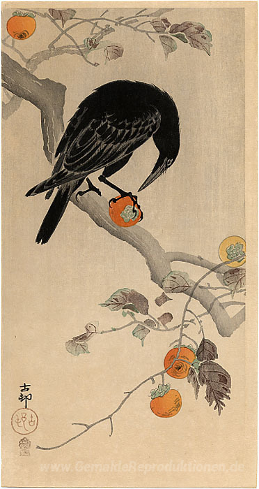 Wir bieten Ihnen eine handgefertigte Reproduktion auf Leinwand des berühmten Kunstwerks 'Crow Essen eine Persimmon' von Ohara Koson, aus dem Reproduktionsmuseum.
