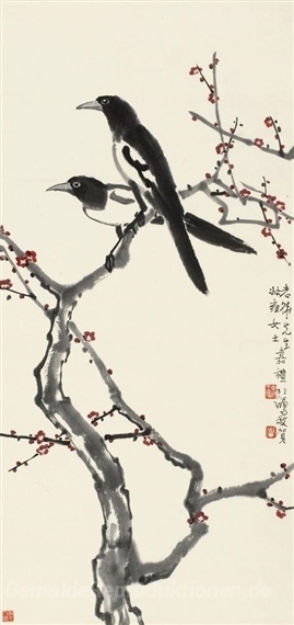 Wir bieten Ihnen eine handgefertigte Reproduktion auf Leinwand des berühmten Kunstwerks 'Elster-und Pflaumen-' von Xu Beihong, aus dem Reproduktionsmuseum.