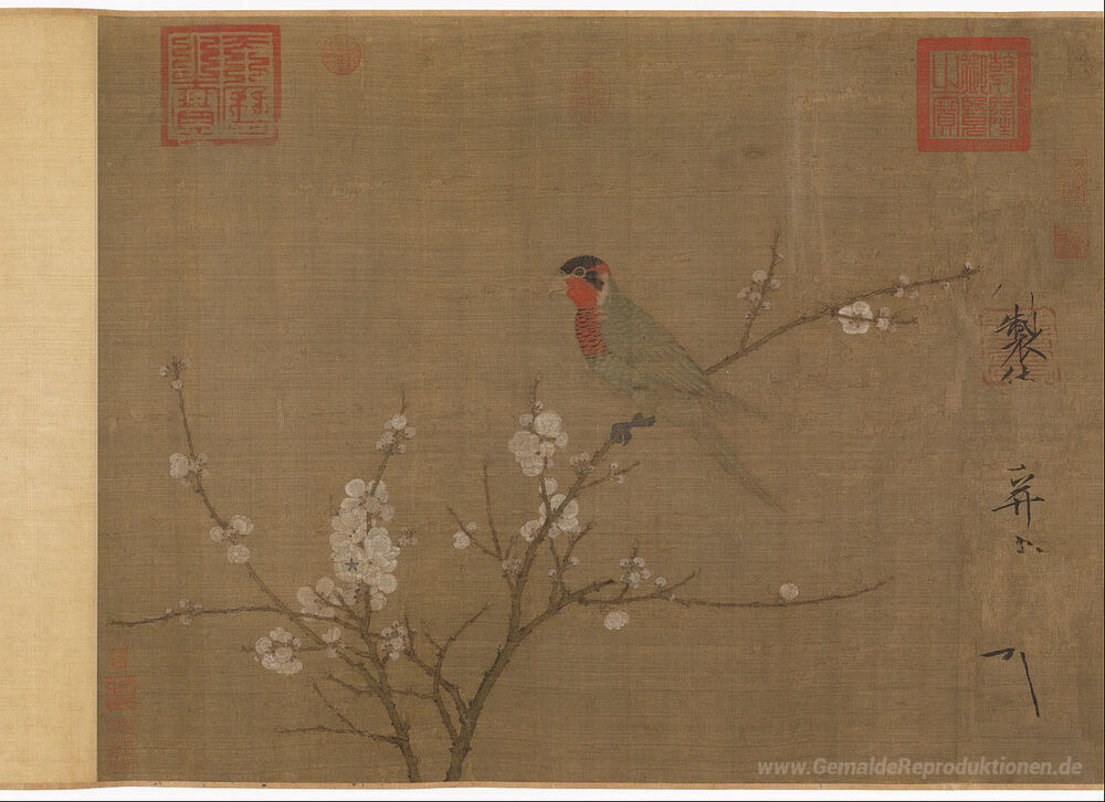 Wir bieten Ihnen eine handgefertigte Reproduktion auf Leinwand des berühmten Kunstwerks 'Fünffarbige Sittich auf einer blühenden Aprikosenbaum' von Emperor Huizong, aus dem Reproduktionsmuseum.